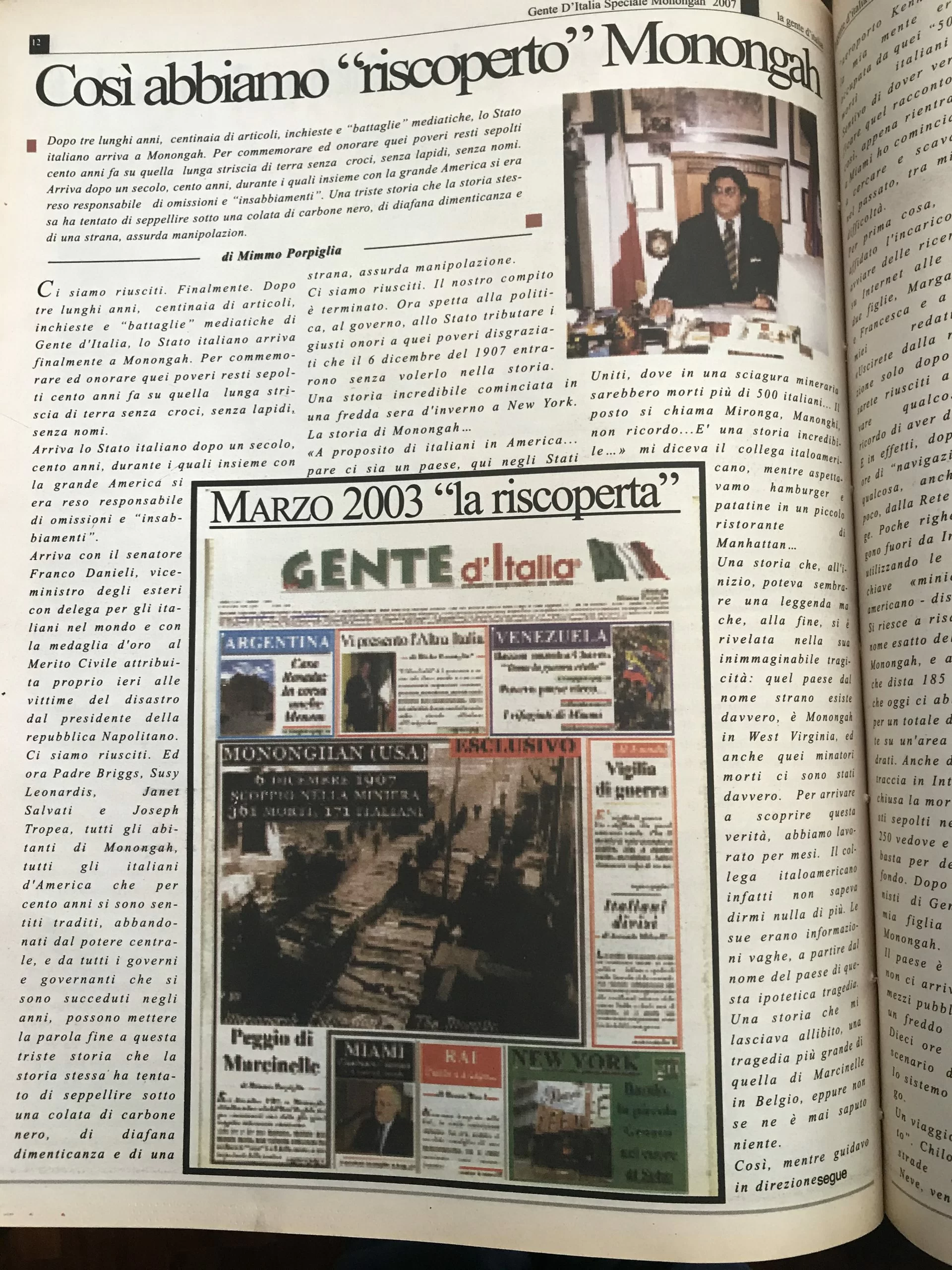 E qui mi corre l'obbligo di ringraziare le tre persone che hanno avuto un peso determinante nel far conoscere al mondo la tragedia di Monongah: il senatore Mario Baccini, sottosegretario agli esteri del governo di allora, l'ambasciatore Sergio Vento capo della nostra diplomazia negli Usa ed il collega Paolo Peluffo direttore del Dipartimento per l'informazione e l'editoria, a quel tempo portavoce del presidente della repubblica Ciampi e capo dell'ufficio stampa del Quirinale.