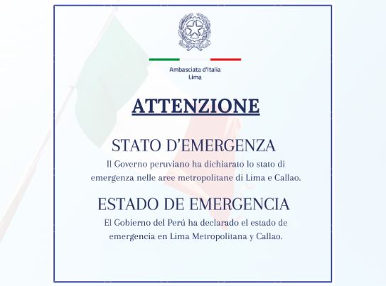 LIMA - L'Ambasciata d'Italia in Perù ha comunicato in queste ore ai connazionali presenti nel Paese sudamericano che, a seguito del notevole aumento della criminalità organizzata a Lima, il Governo peruviano ha dichiarato lo Stato d'Emergenza.