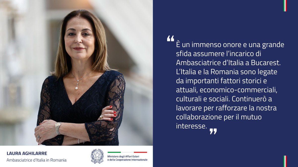 ROMA - “È un immenso onore e una grande sfida assumere l’incarico di ambasciatrice d’Italia a Bucarest. L’Italia e la Romania sono legate da importanti fattori storici e attuali, economico-commerciali, culturali e sociali. Continuerò a lavorare per rafforzare la nostra collaborazione per il mutuo interesse”. Queste le prime parole di Laura Aghilarre nella sua nuova veste di ambasciatrice d’Italia in Romania, incarico che ha assunto ufficialmente ieri, subentrando ad Alfredo Durante Mangoni.