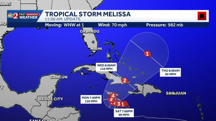 Melissa ha attraversato la punta orientale di Cuba mercoledì scorso per sette ore come uragano di categoria 3 (su 5) sulla scala Saffir-Simpson, con venti fino a 200 chilometri orari e precipitazioni totali fino a 400 millimetri.
