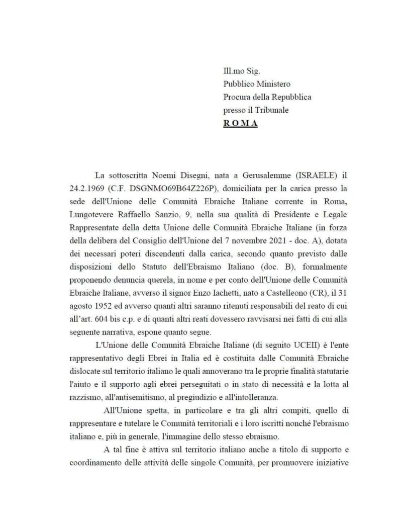 Ma non è tutto: nella denuncia viene citata una frase ancora più forte, secondo Ucei, “il sionismo controlla tutto il mondo, controlla l’America, controlla le banche. Le banche svizzere sono in mano ai sionisti ebrei”, che, secondo l’associazione richiamerebbe stereotipi antiebraici della propaganda nazista e teorie complottiste storiche.