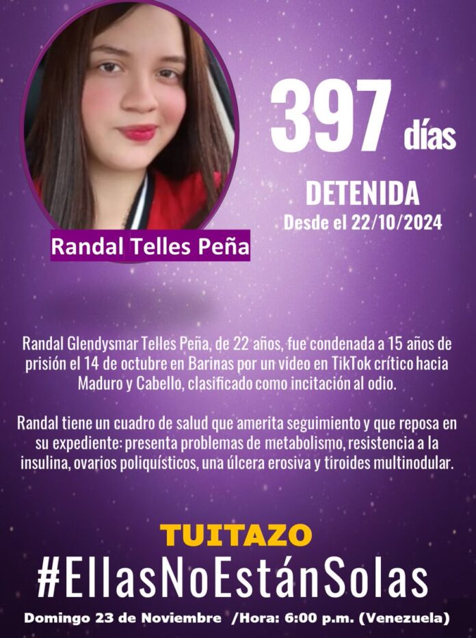 La ventiduenne venezuelana Randal Glendysmar Telles Peña ha compiuto il 22 novembre il suo tredicesimo mese di detenzione dopo essere stata condannata a 15 anni di carcere per "promozione e incitazione all'odio".