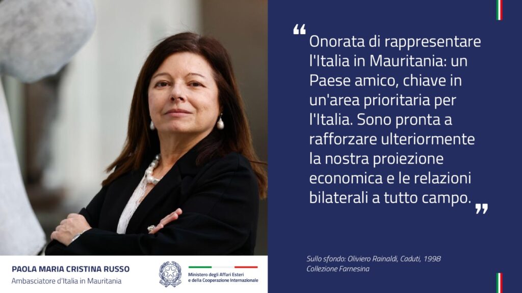 NOUAKCHOTT – Maria Cristina Russo ha iniziato oggi il mandato di Ambasciatrice d’Italia a Nouakchott, in Mauritania. Maria Cristina Russo subentra a Laura Bottà. “Onorata di rappresentare l’Italia in Mauritania: un Paese amico, chiave in un’area prioritaria per l’Italia. Sono pronta – scrive la nuova Ambasciatrice – a rafforzare ulteriormente la nostra proiezione economica e le relazioni bilaterali a tutto campo”. Nata a Bassano del Grappa (Vicenza) il 31 ottobre 1965, Maria Cristina Russo si laurea in Scienze Politiche all’Università di Padova nel 1997. In seguito ad esame di concorso, entra nella carriera diplomatica il 29 dicembre 2000. Dopo un primo incarico al cerimoniale del Ministero degli Esteri, dal 2004 è Primo Segretario commerciale a Dakar , Senegal. Nel 2008 è Console a Dortmund, Germania. Nel 2012 rientra al Ministero degli Esteri, dove presta servizio alla Direzione Generale per gli Italiani all’Estero e le Politiche Migratorie. Dal 2015 è Consigliere a Rabat, Marocco, e dal 2019 è Consigliere a Berna, Svizzera. Nel 2023 rientra alla Farnesina, dove presta servizio alla Direzione Generale per la Mondializzazione e le Questioni globali. Dal 1° dicembre 2025 è Ambasciatrice d’Italia presso la Repubblica Islamica di Mauritania. Dal 2014 è Cavaliere dell’Ordine al Merito della Repubblica.