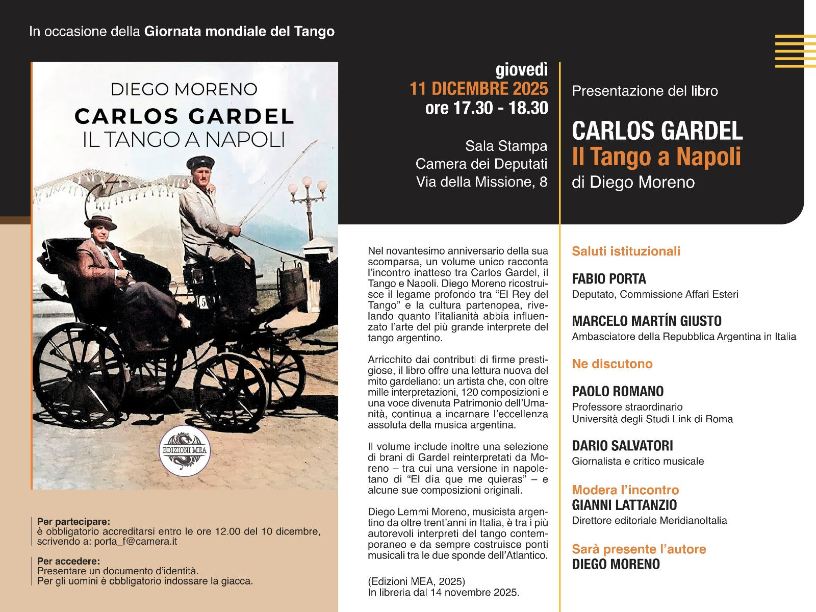 L’on. Fabio Porta, in occasione della Giornata Mondiale del Tango, presenterà il volume “Carlos Gardel. Il Tango a Napoli” di Diego Moreno, in uscita nelle librerie italiane in questi giorni. L’evento si svolgerà giovedì 11 dicembre 2025, dalle ore 17.30 alle 18.30, presso la Sala Stampa della Camera dei Deputati, in Via della Missione 8.