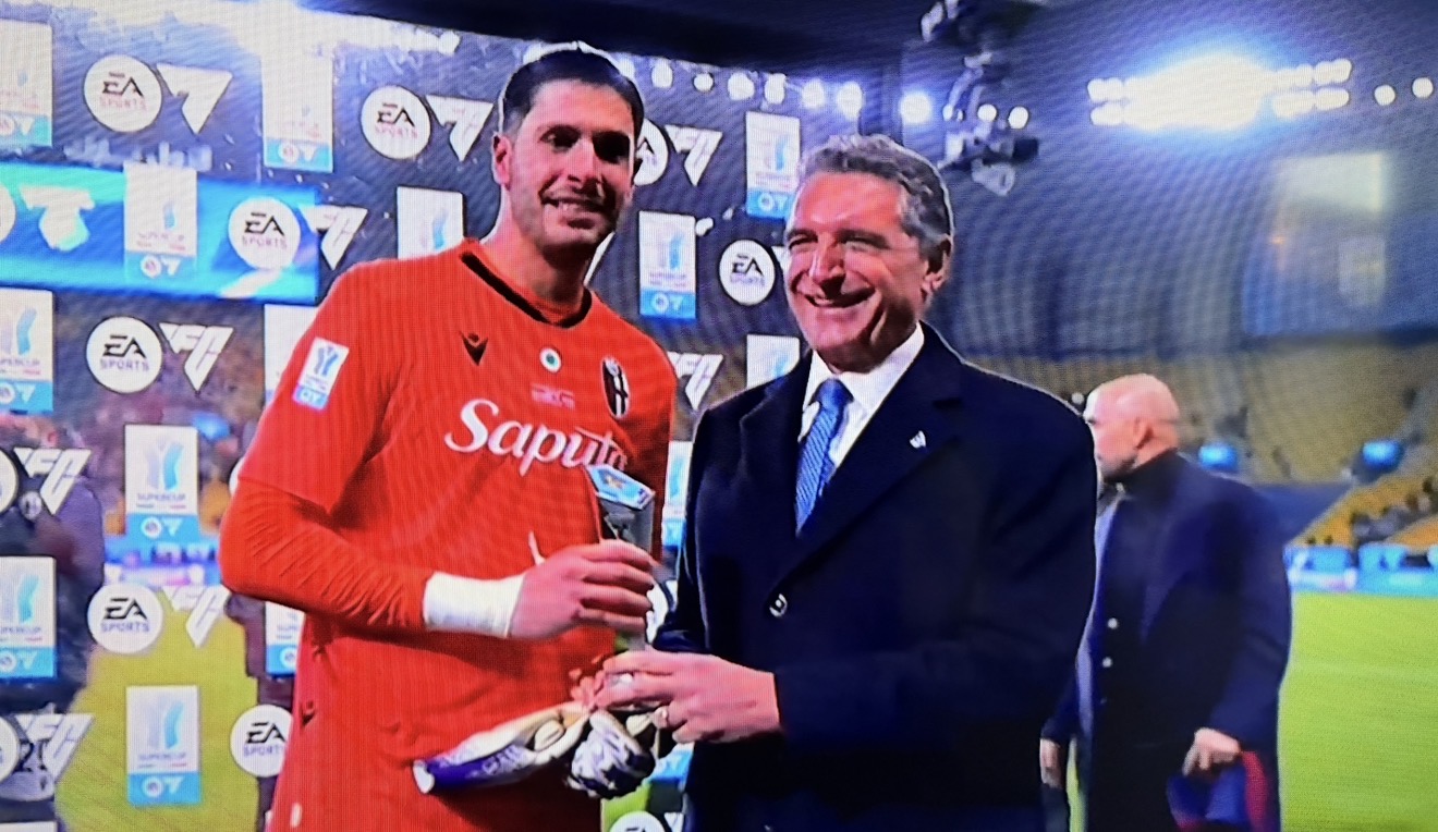 I rossoblù battono l'Inter 4-3 ai rigori (1-1 al 90') e lunedì sempre a Riad contenderanno il trofeo al Napoli. I nerazzurri partono bene, andando in vantaggio dopo soli due minuti con Thuram, che calcia al volo in rete un bel cross di Bastoni. Al 35' il Bologna pareggia su rigore, concesso da Chiffi dopo il controllo Ofr per un mani di Bisseck. L'arbitro nella ripresa fischia un penalty anche a favore dell'Inter, per fallo su Bonny, ma richiamato al video cambia idea e lo revoca. La squadra di Chivu guida il gioco e tira spesso, ma Ravaglia replica sempre quando serve e il risultato non si sblocca, rendendo necessari i rigori anche sei nei minuti finali Martinez si supera su tiro di Fabbian. Dal dischetto segna Lautaro, seguito da Ferguson, poi Ravaglia si oppone a Bastoni, Martinez a Moro mentre Barella e Miranda tirano alto. Ancora protagonista Ravaglia che para il penalty di Bonny, poi gol di Rowe, e Vrij e alla fine è Immobile a realizzare il rigore decisivo.