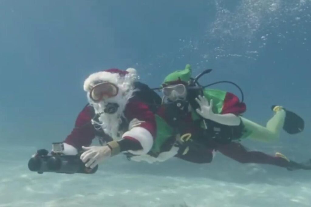 L’esperto di immersioni Spencer Slate si è tuffato anche quest’anno nella calde acque della Florida. Slate, mantenendo viva una tradizione che va avanti da oltre 35 anni, ha compiuto la sua immersione vestito da Babbo Natale, con tanto di elfi in costume al suo seguito e una sirena in versione natalizia. Poco dopo il tuffo, l’esperto di immersioni si è trovato circondato da banchi di pesci, incontrando anche una murena verde di grandi dimensioni e perfino uno squalo. Questa particolare usanza, ovvero l’annuale immersione subacquea di Babbo Natale, coincide quest’anno con il 35° anniversario del Florida Keys National Marine Sanctuary, concepito per proteggere l’unica barriera corallina vivente del Nord America e le acque che circondano l’arcipelago.